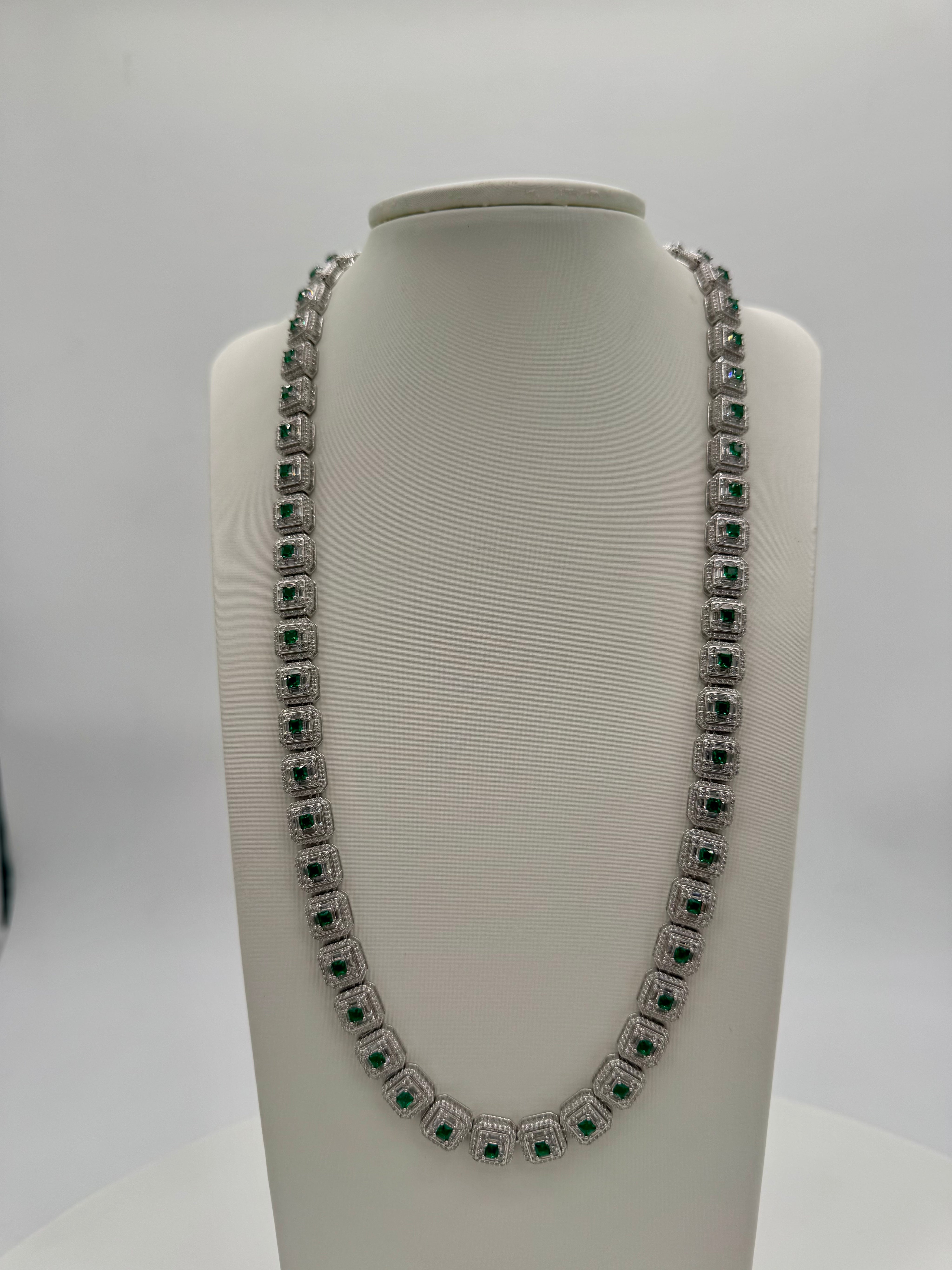 Cadena de plata repleta de circonitas y en el centro piedra verde, 60cm.