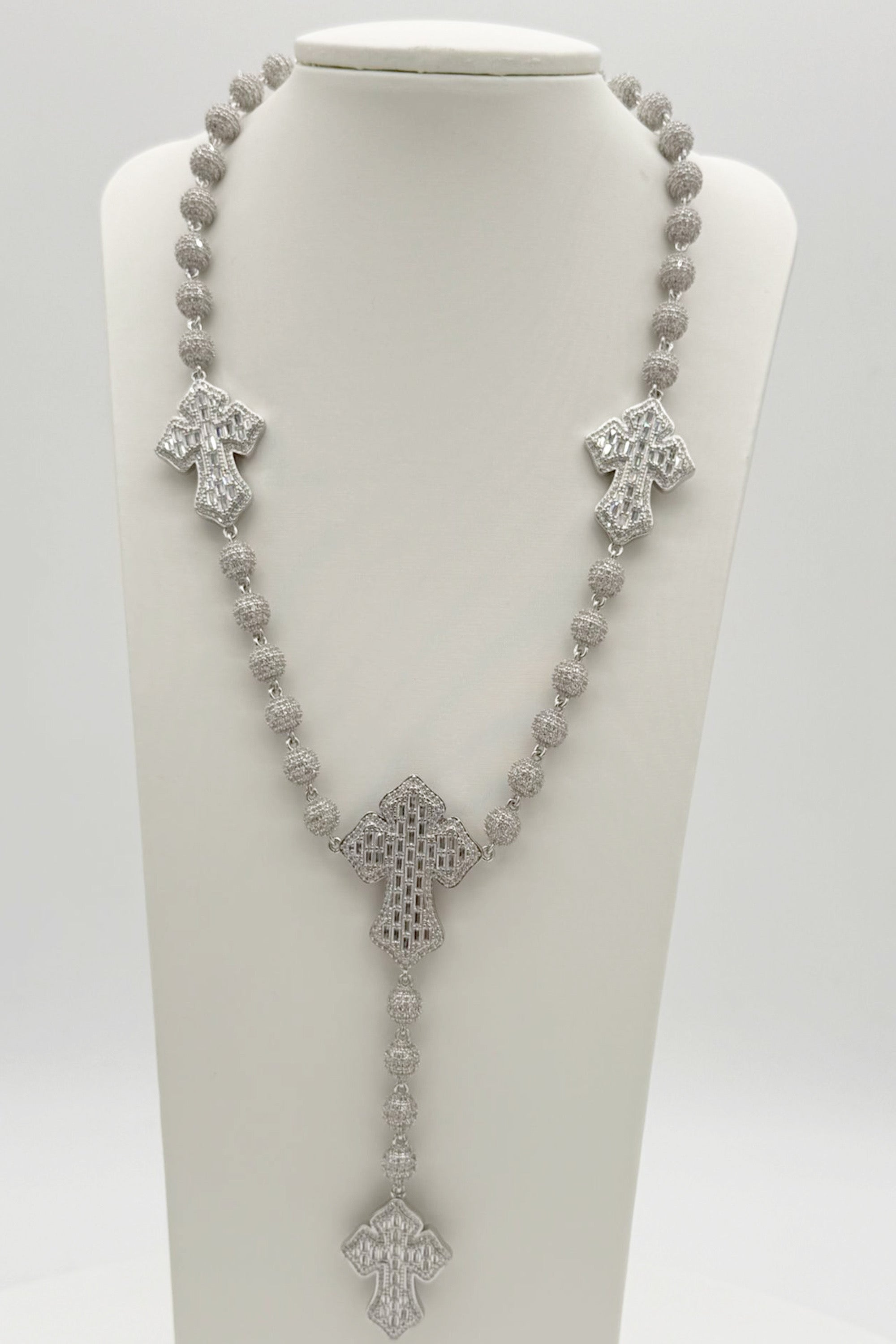 Rosario de plata con bolas de diámetro 8,6 milímetros con circonitas en ellos Cruz central de 4 cm con circonitas cruz de abajo y lateral 3 cm medida de largo 50 cm a liarte la cadena que cuelga piezas únicas