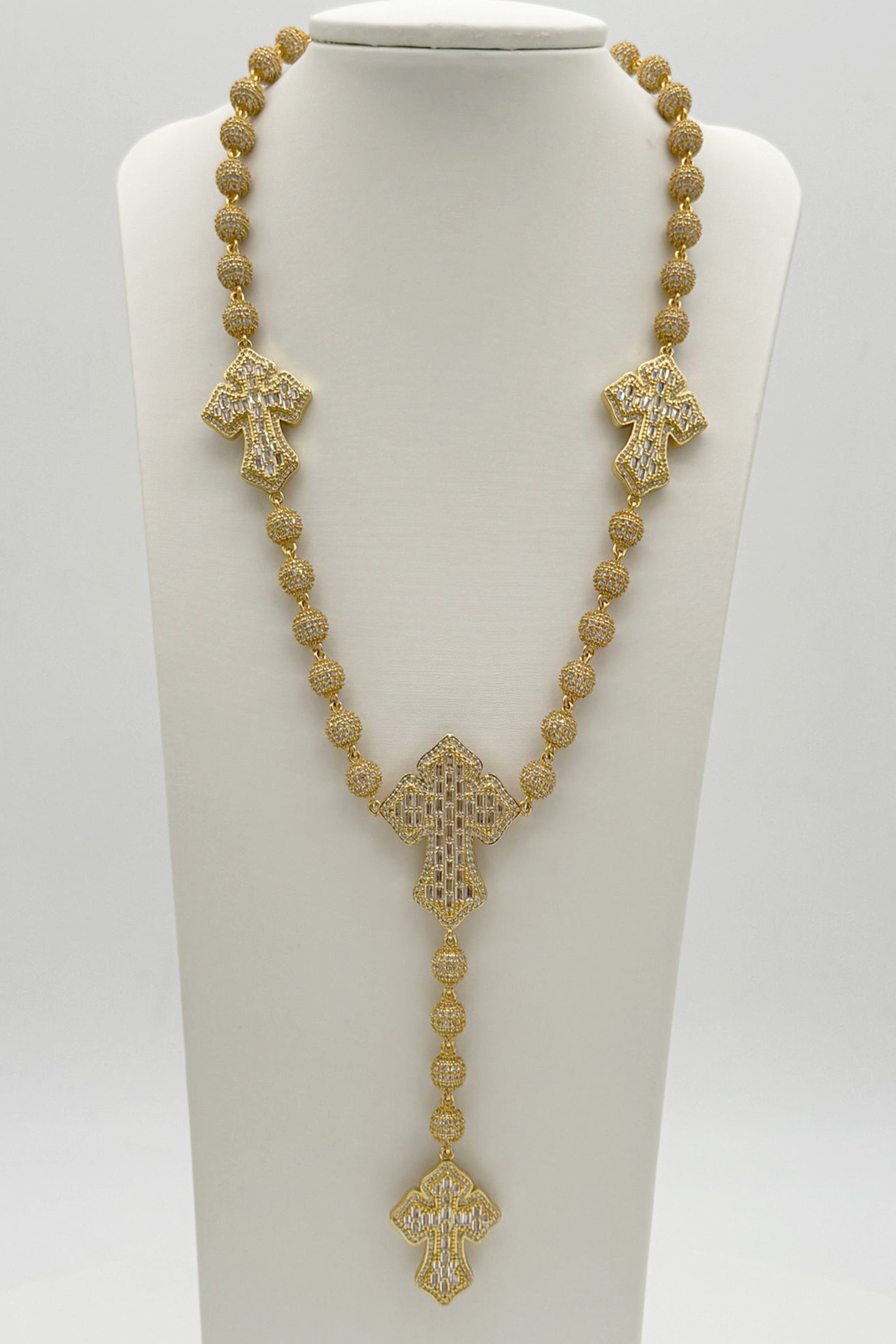 Rosario de plata chapada con bolas de circonita de 8,5 milímetros de diámetro, cruces con circonitas la central medida de 4 cm , las cruces laterales y la de abajo 3 cm , medida de largo 50 cm aparte trozo de cadena con cruz pieza única